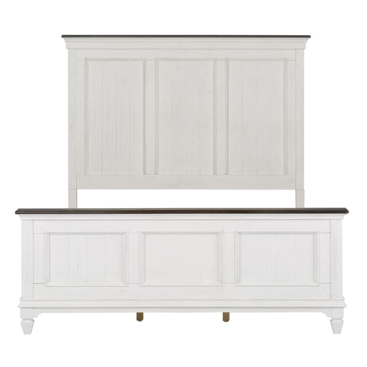 Create a classic look with a casual feel using the Allyson Park panel bed. The two-toned wire brushed white finish with charcoal tops creates a cottage style that works anywhere from the beach to the mountains. Crafted with pine solids and veneers with cathedral white oak tops, this piece features a center slat support system, bolt on rails, bead molding, and charcoal grey cap rails.