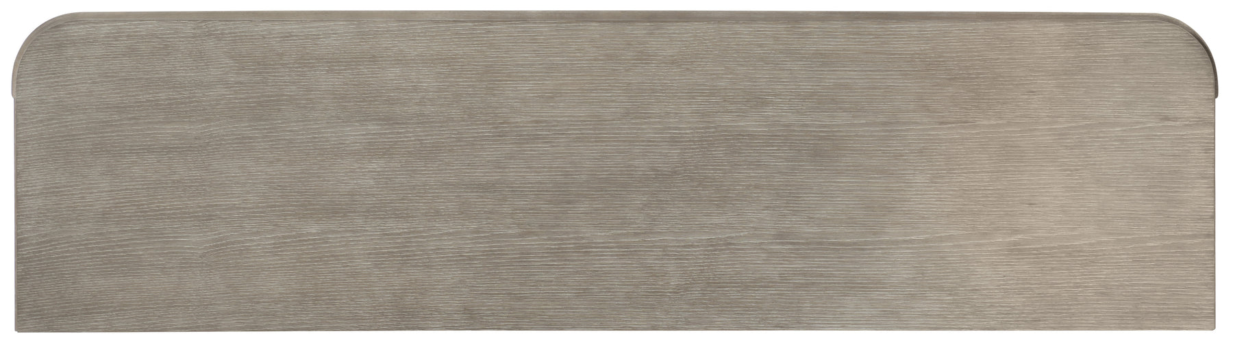 Soft, rounded forms combine with sand-blasted greige and antique white finishes to create an inviting transitional boutique collection in Affinity. The main finish for the 20-piece collection of bedroom, dining room, occasional, accents and home entertainment is a wire-brushed greige (gray/beige) on quartered white oak. Pewter and antique white hardware and soft linen fabrics add intrigue.