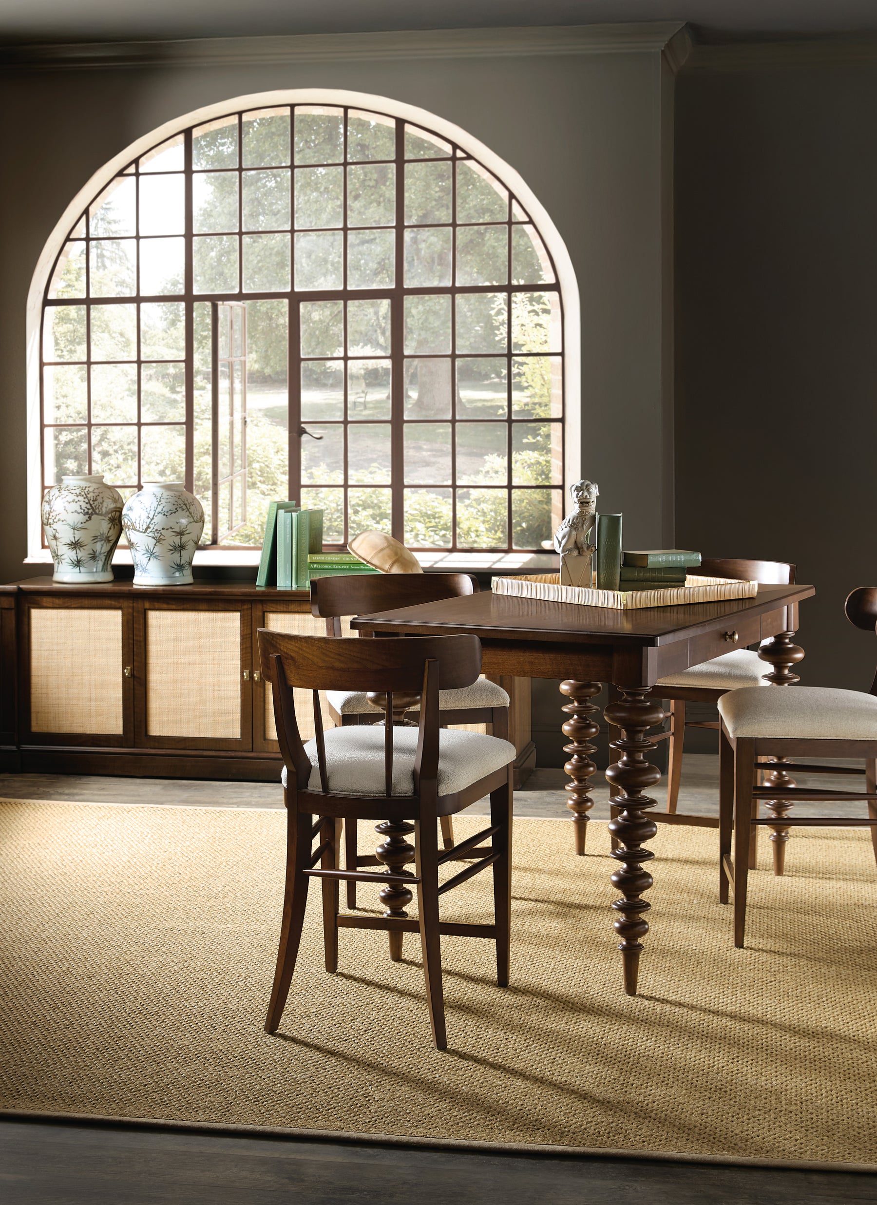 The Archives Gathering Table from the Archives Collection taps into the "hipstoric" design trend, blending modern style with rich historical elements. Crafted with cathedral figured walnut veneers, oak veneers, and a solid wood-edged top, this counter-height dining table features a high-clarity Classic Walnut finish that adds depth and richness to its timeless design. Its rectangular shape is perfect for casual dining or entertaining, with a turned leg design that enhances its traditional, formal appeal. The single drawer offers functional storage, and Hooker Furniture's meticulous craftsmanship ensures durability and smooth drawer operation. This piece complements a wide range of interior styles, offering both elegance and practicality to dining spaces.