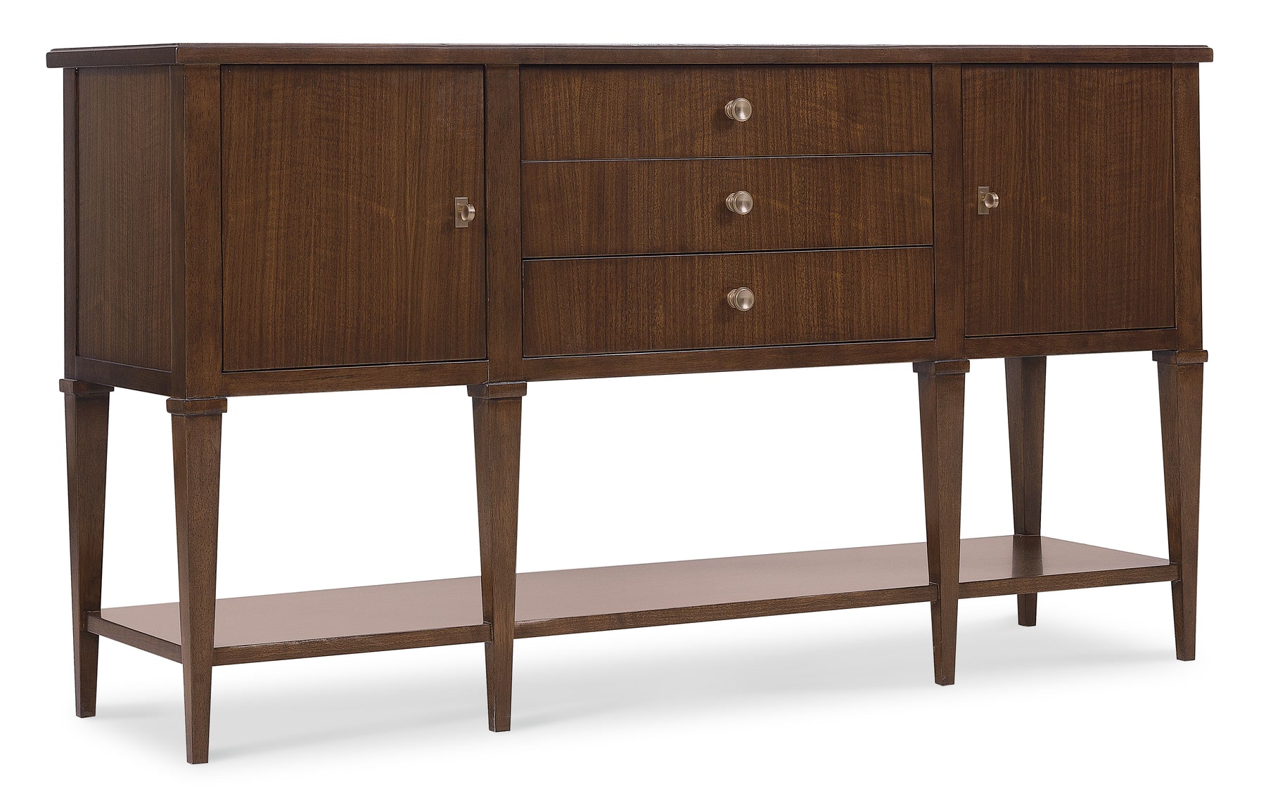Make a sophisticated statement with the Archives Server, combining refined materials like figured walnut veneers, and a striking Castle Grey marble top. The high clarity Classic Walnut finish enhances the server’s depth and richness, while satin brass hardware adds a luxurious touch. Featuring two doors, three drawers, and an adjustable shelf, this server offers ample storage space, including a silverware tray. Perfect for the dining room, this piece offers both practical function and timeless design, ideal for those who appreciate structured elegance.