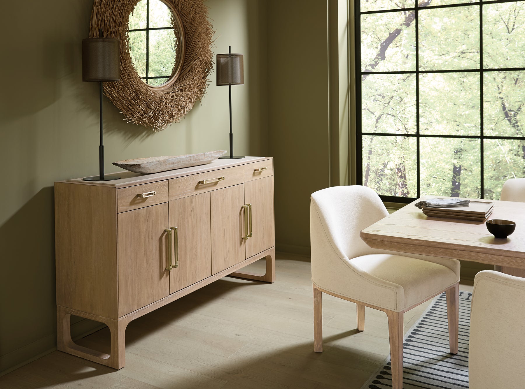 The Banyon Bay Buffet combines ample storage with modern design. Featuring four doors with adjustable shelves behind each pair, three drawers, and a silverware tray, this buffet provides plenty of space for dining essentials. The Egyptian marble top adds a touch of luxury, while the brushed brass hardware and Desert Oak finish create a cohesive, contemporary look. This piece is ideal for dining rooms looking for both function and style.