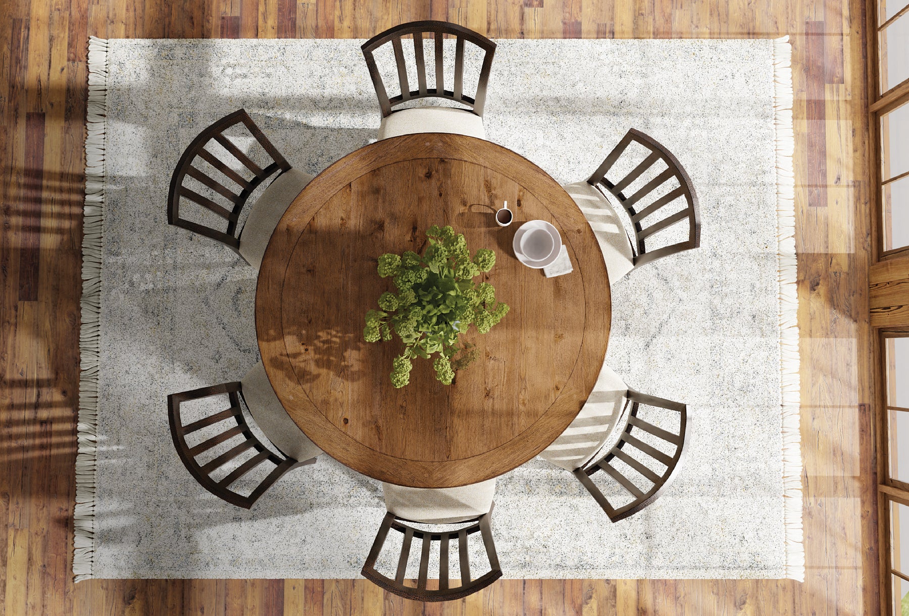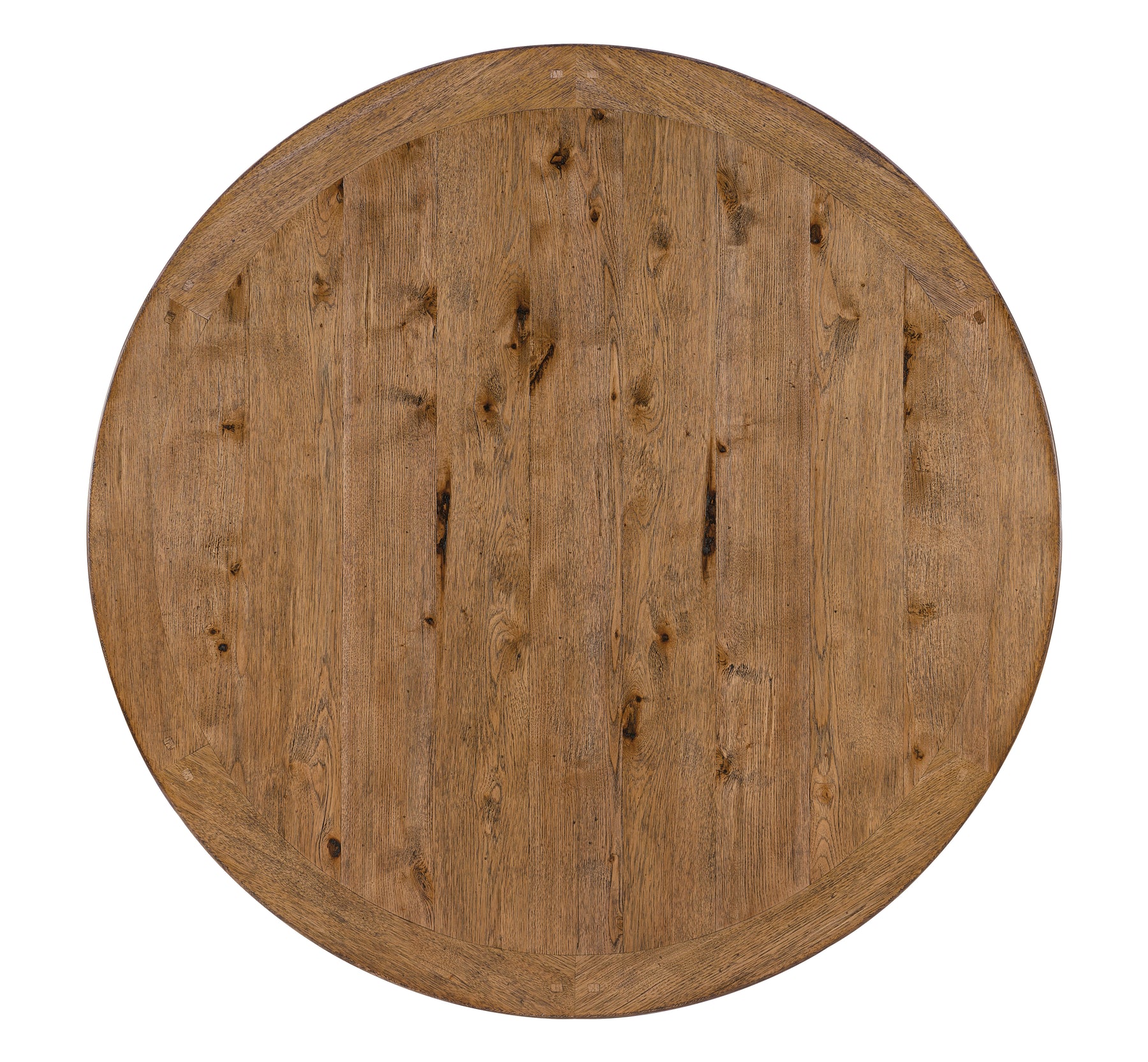 Tactile and rustic and evoking the artistry of true craftsmanship, the 60-inch round Big Sky Dining Table has an urn-shaped base finished in the Charred Timber color. The contrasting top is in Vintage Natural, a warm, organic finish over Hickory Veneers and a solid-wood edged top. Table accommodates ups to 6 coordinating dining chairs.