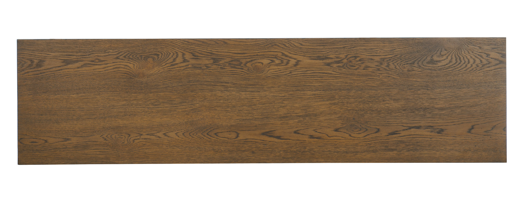 Craftsman style gets a casual modern twist with the Chapman Buffet, constructed of White Oak Veneers with a warm brown Sorrel finish revealing the woodgrain and a refined decorative veneer pattern. Custom hardware in a forged pewter finish is complemented by a thinly-scaled metal base and stretcher. Featuring 4 doors with soft-close hinges, there is one drawer and one adjustable shelf behind each pair of doors, and the left drawer has a removable felt lined silverware tray. Ventilated back panel.