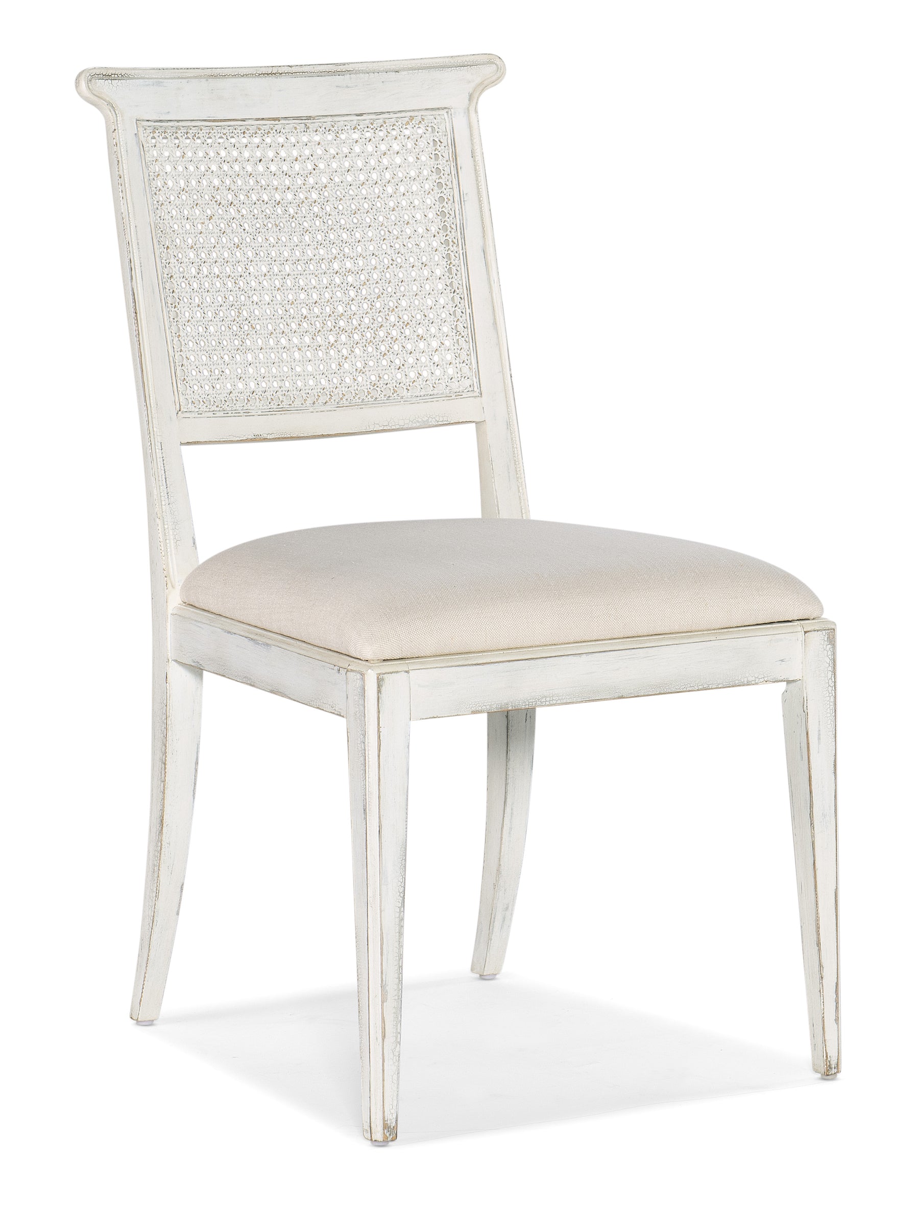 Inspired by the tropical craftsmanship of the West Indies and the woven cane accents of classic British and Dutch Colonial design, the Charleston Upholstered Seat Side Chair has an oyster-colored fabric seat and a cane back. The finish is Magnolia White, a color originally created from the purest limestone, used to paint the pillars, posts and fences of classic Southern homes.