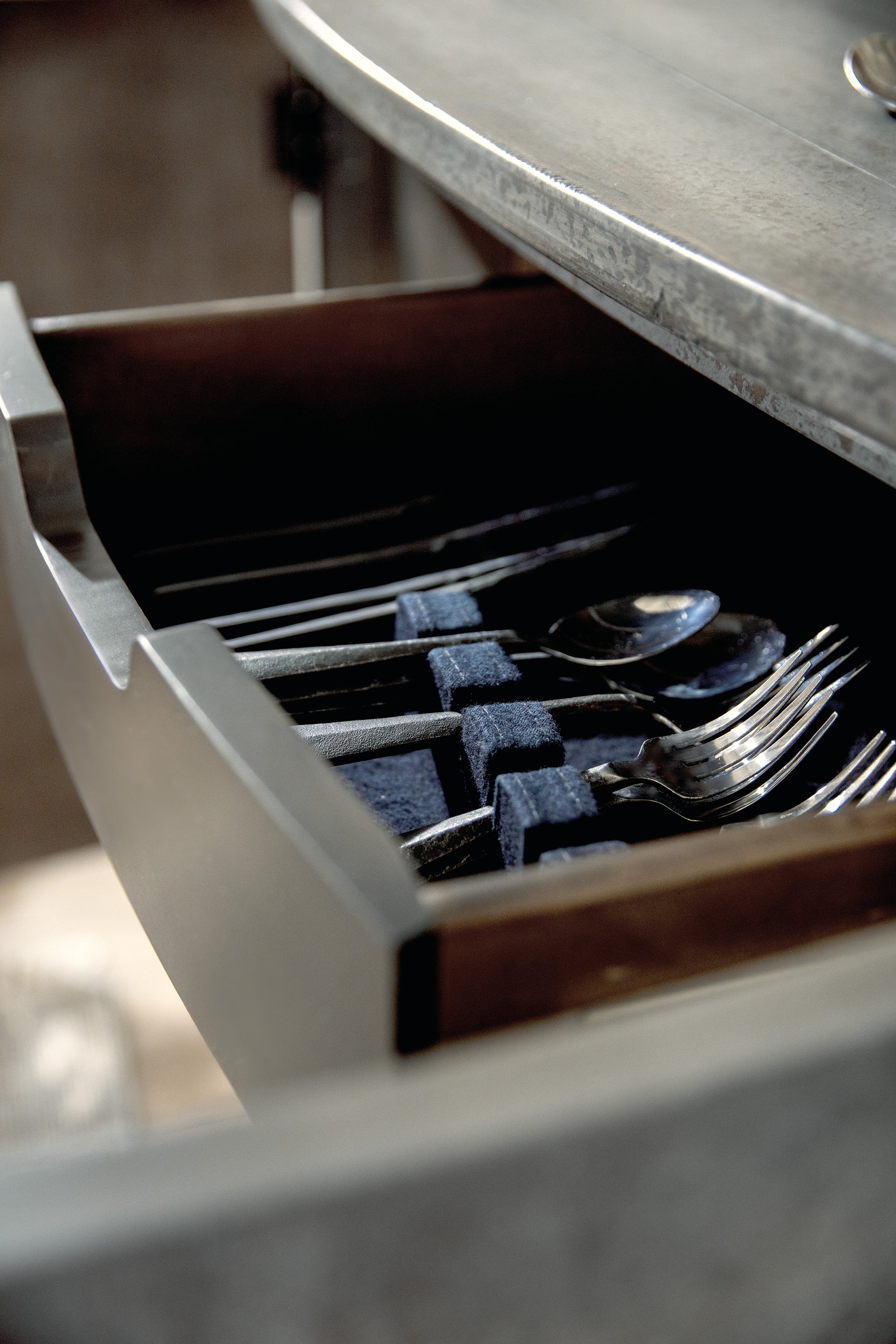 Drawer have cut-out hand pulls, drop-in felt liners and one with silverware storage