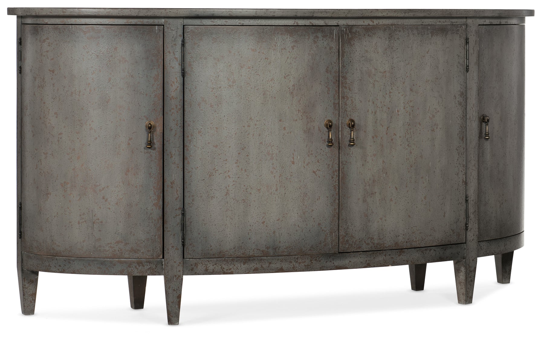 Inspired by European farmhouses, the graceful silhouette of the Ciao Bella Buffet will give a designer flair to any room. As a delightful bonus, this piece is packed with storage, with one adjustable shelf behind each pair of center doors, 2 fixed shelves behind the left and right doors, 2 drawers behind the center doors and drop-in felt liners with silverware storage. Crafted of Poplar and Hardwood Solids with Maple Veneers, the buffet features a character-filled Speckled Gray finish with hand chiseling and multi-layer rub-through. Tear-drop hardware adds a sparkle of style.