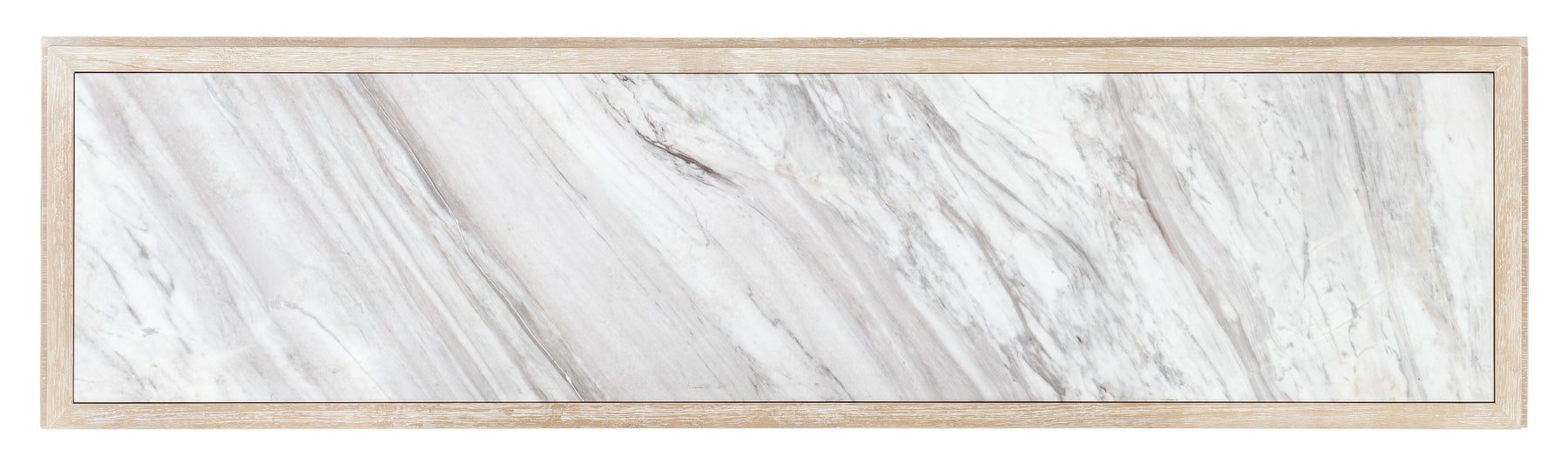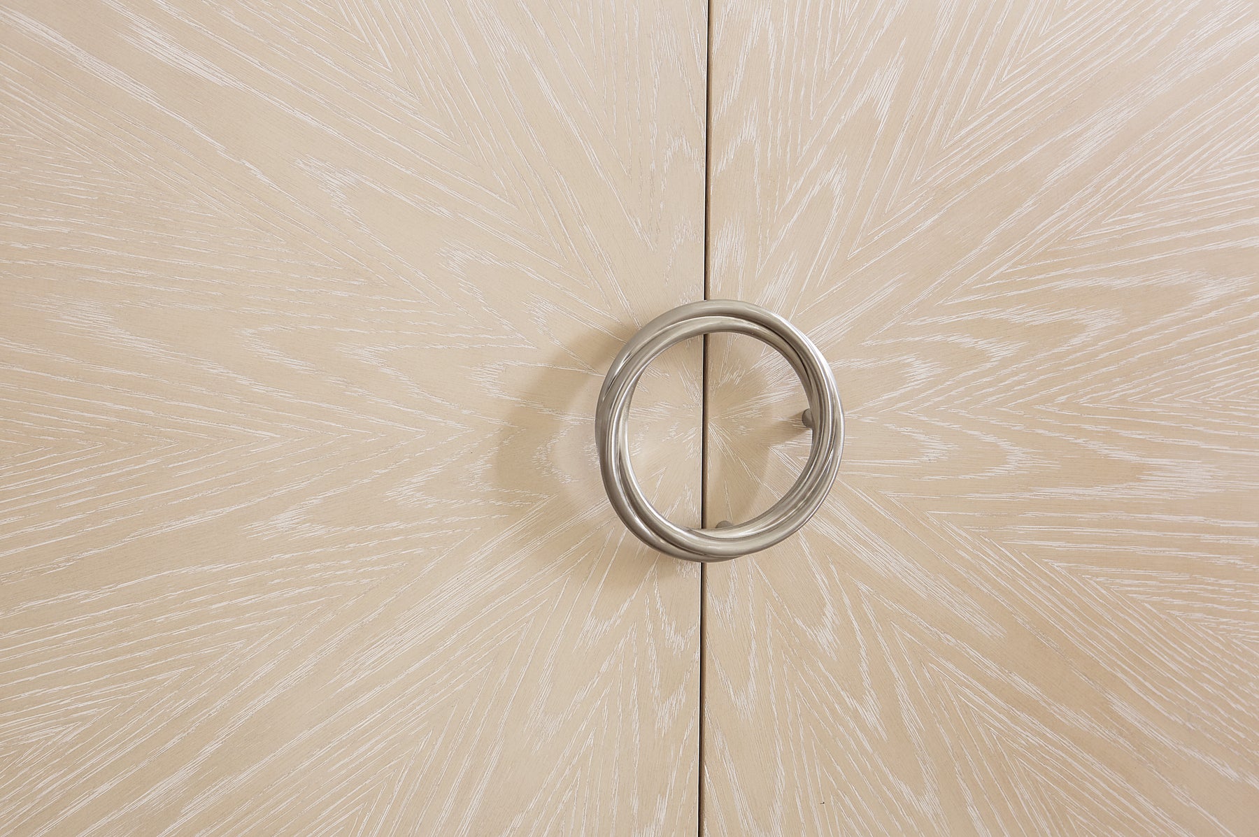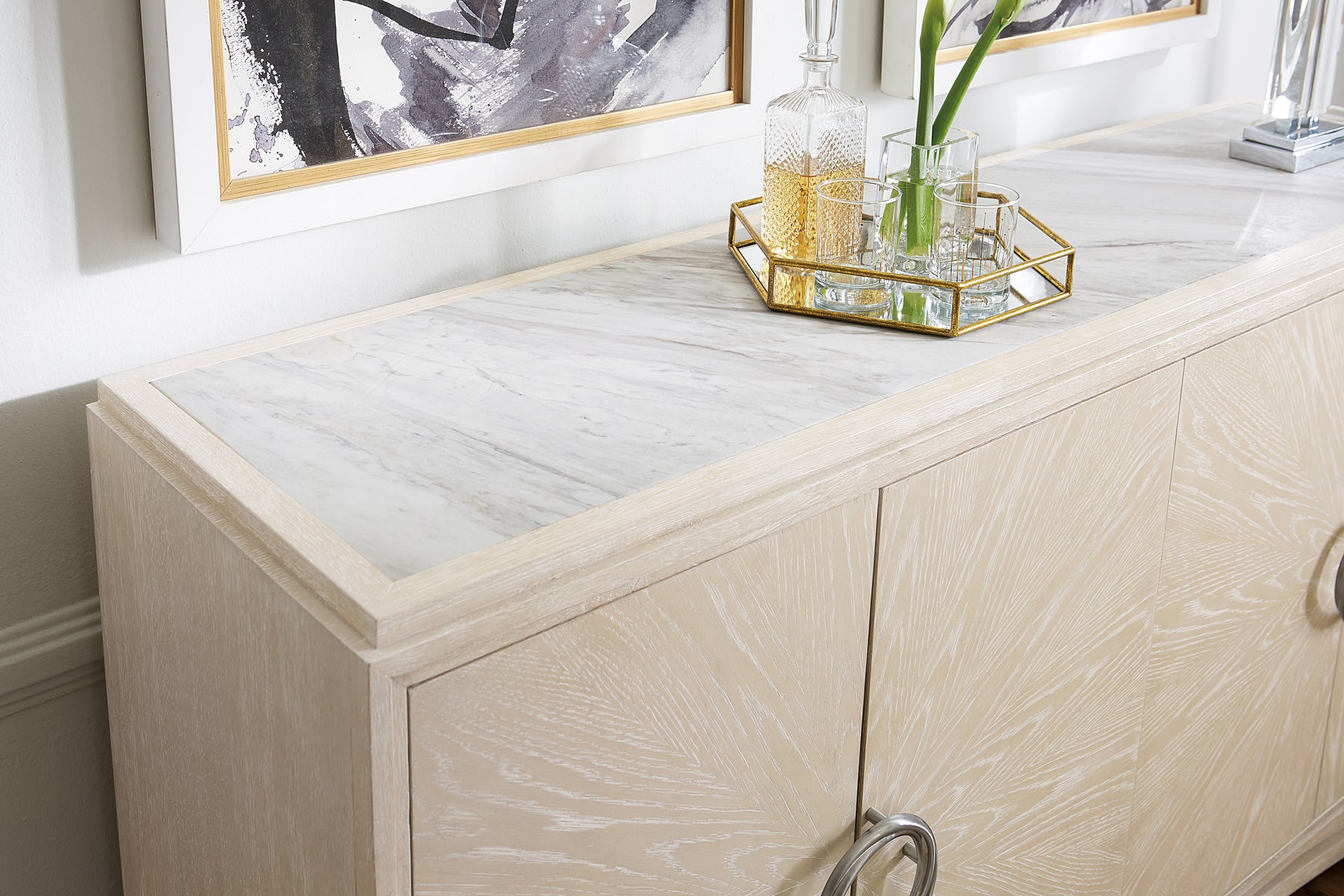 A brilliant fusion of classic architectural design elements, soft shapes and faux metal accents, the Nouveau Chic Buffet blends fashion and function. Crafted of Cathedral and Quartered Oak Veneers with a serene Sandstone finish, the buffet has four doors with soft-close hinges and magnetic door catches and one self-closing drawer behind each pair of doors. The left side drawer has a drop-in felt-lined silver tray, and there’s one adjustable shelf behind each pair of doors. Includes a ventilated back panel and a three-plug outlet behind the right door.