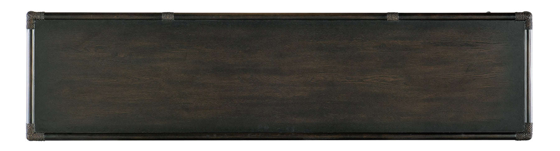 With a laid-back island vibe and mix of organic materials, the Retreat Pole Rattan Sideboard is crafted of Oak and Maple Veneers with rope accents at the joints. The Black Sand finish is transparent by design to reveal the unique grain patterns of the wood veneer. Featuring ample storage, the sideboard has two doors with magnetic door catches with one adjustable shelf behind each door. There are two self-closing drawers, and the top drawer has a removable felt liner and removable silverware tray. The lower fixed shelf is ideal for display or storage. Soft pewter bar pull and “T” pulls on the doors add a distinct accent.