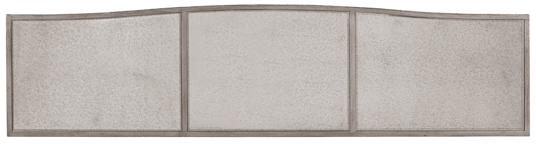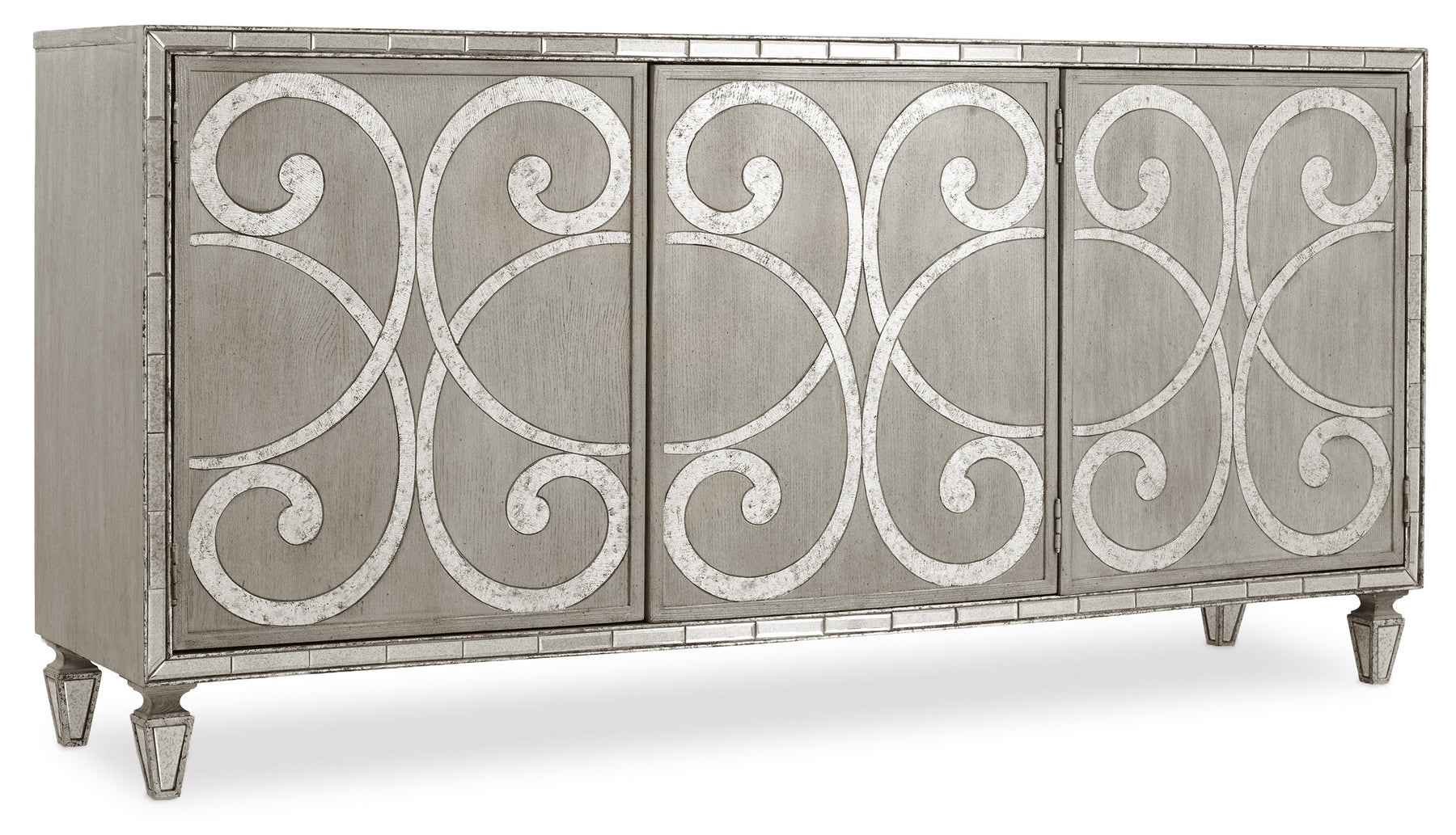Create a luxe atmosphere with this glamorous buffet with dual-function capability as an entertainment center to accommodate up to a 75-inch TV. Crafted of Poplar and Hardwood Solids, it is adorned with the Epoque finish, a greige with shimmer on Oak veneers. Three doors with touch latches have one adjustable shelf behind each door.