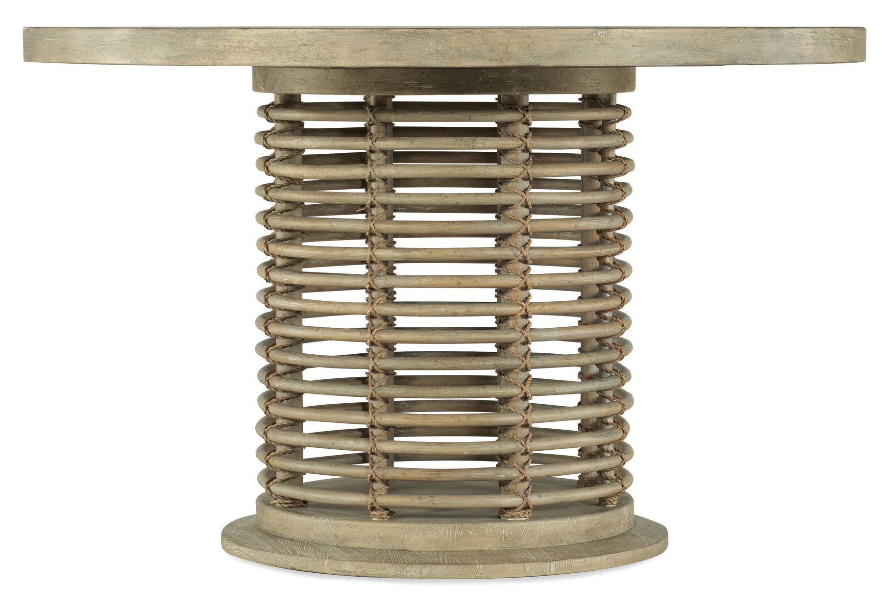 Linger and relax around this 48-inch round rattan table inspired by the laid-back California coast. A marvel of craftsmanship, the Surfrider table combines natural materials of cane, rope and Pecan Veneers with a solid wood edge top and hand-tied jute rope on the table base. Epitomizing the lifestyle of a casual, beach-town community, the Surfrider dining table includes the base and top and features the light natural Driftwood finish with distressing including sandblasting and bleaching.