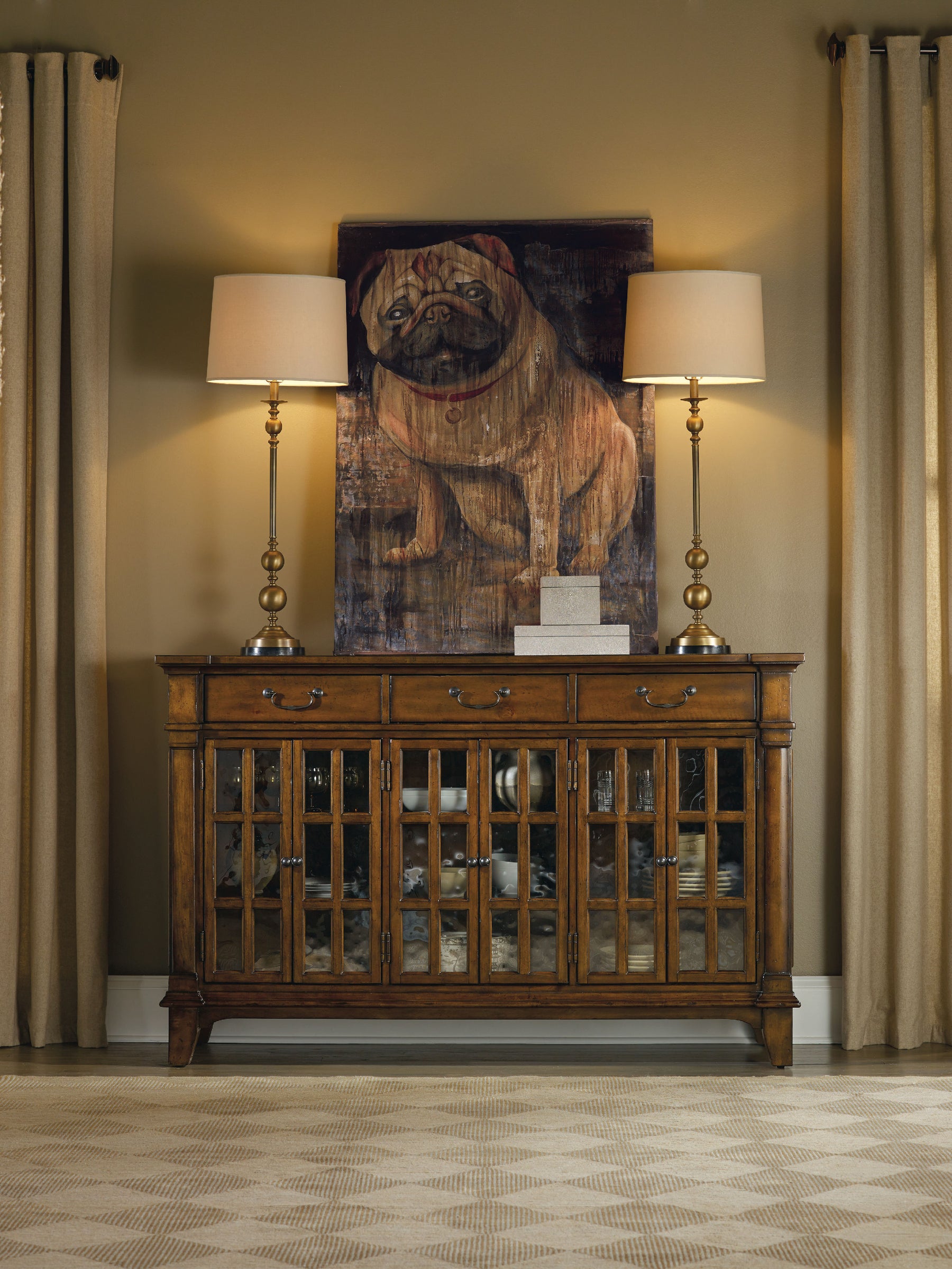 Inspired by the manor homes and equestrian life of the English countryside, the signature Tynecastle Buffet combines classic Georgian architectural details with more rustic timber-frame elements for a Hunt Country ambience. The warm, chestnut-colored rustic finish over figured Alder veneers creates a canvas of comfort and classic appeal. The six doors have vintage seeded glass and 2 adjustable wood shelves behind each door. Three felt-lined drawers, and the center drawer has a silverware tray. A total of six shelves for storage.