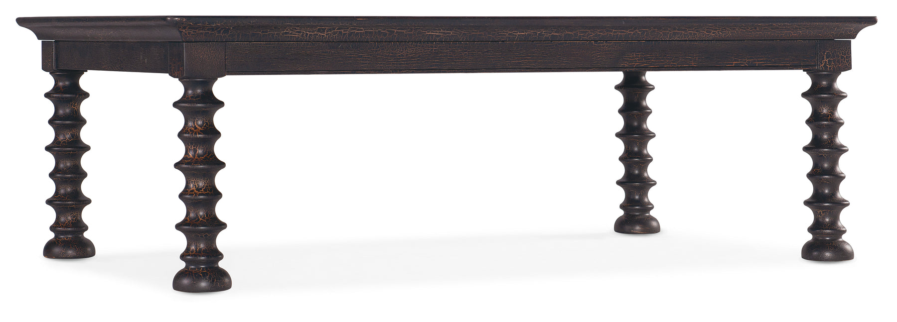 The vintage design of the Big Sky Turned Leg Cocktail Table evokes a simpler time and place in the natural beauty of the American countryside. Crafted of Pecky Hickory Veneers with a solid-wood edged top, it’s finished in Charred Timber, inspired by the restorative beauty of a fire-ravaged forest.