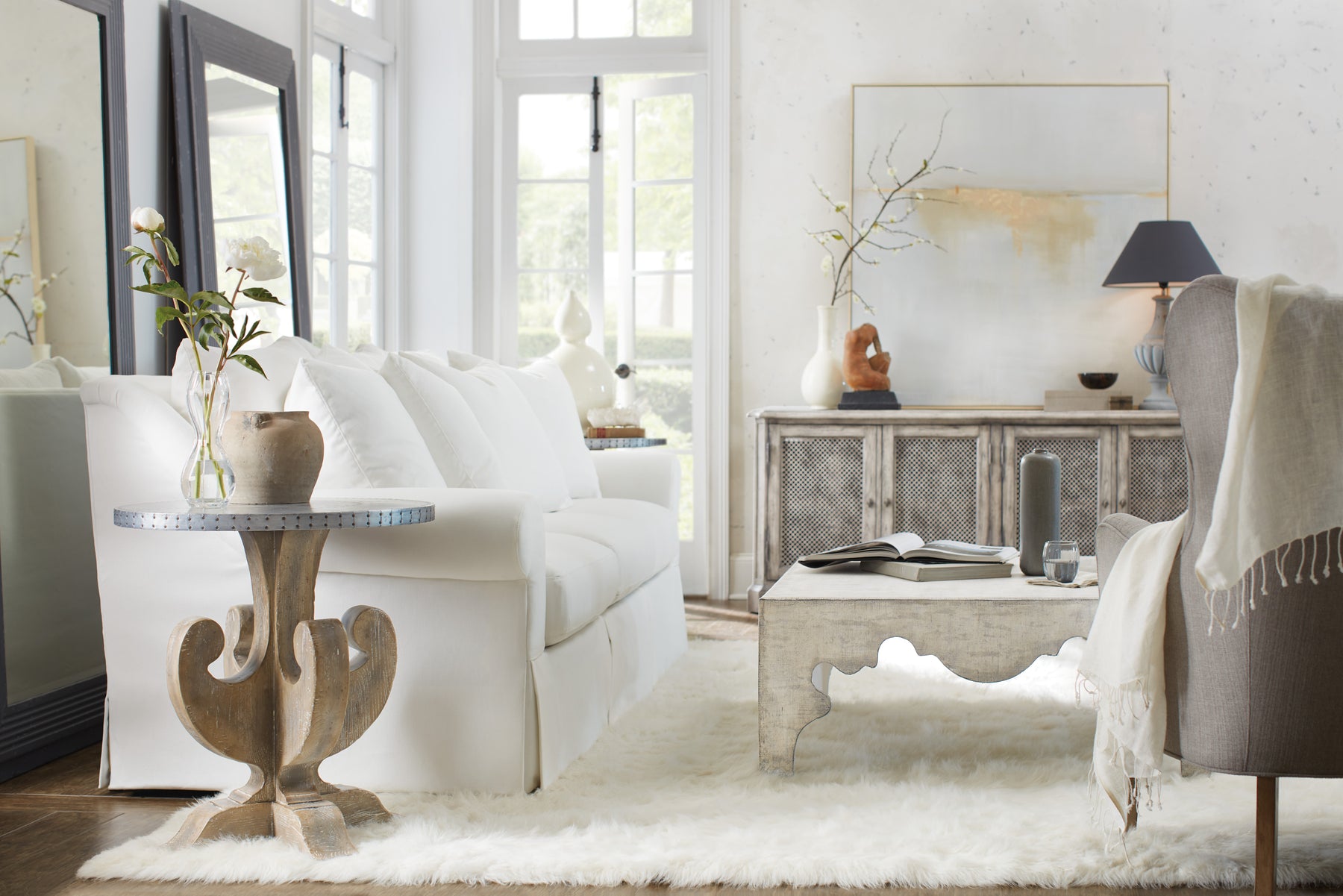With a romantic Belgian flair, the sculptured, shaped legs of the Flanders Square Cocktail combine with a Grain Sack white finish applied over linen to give the textural appeal of a plaster wall. The plaster surface provides protection and is smooth to the touch.
