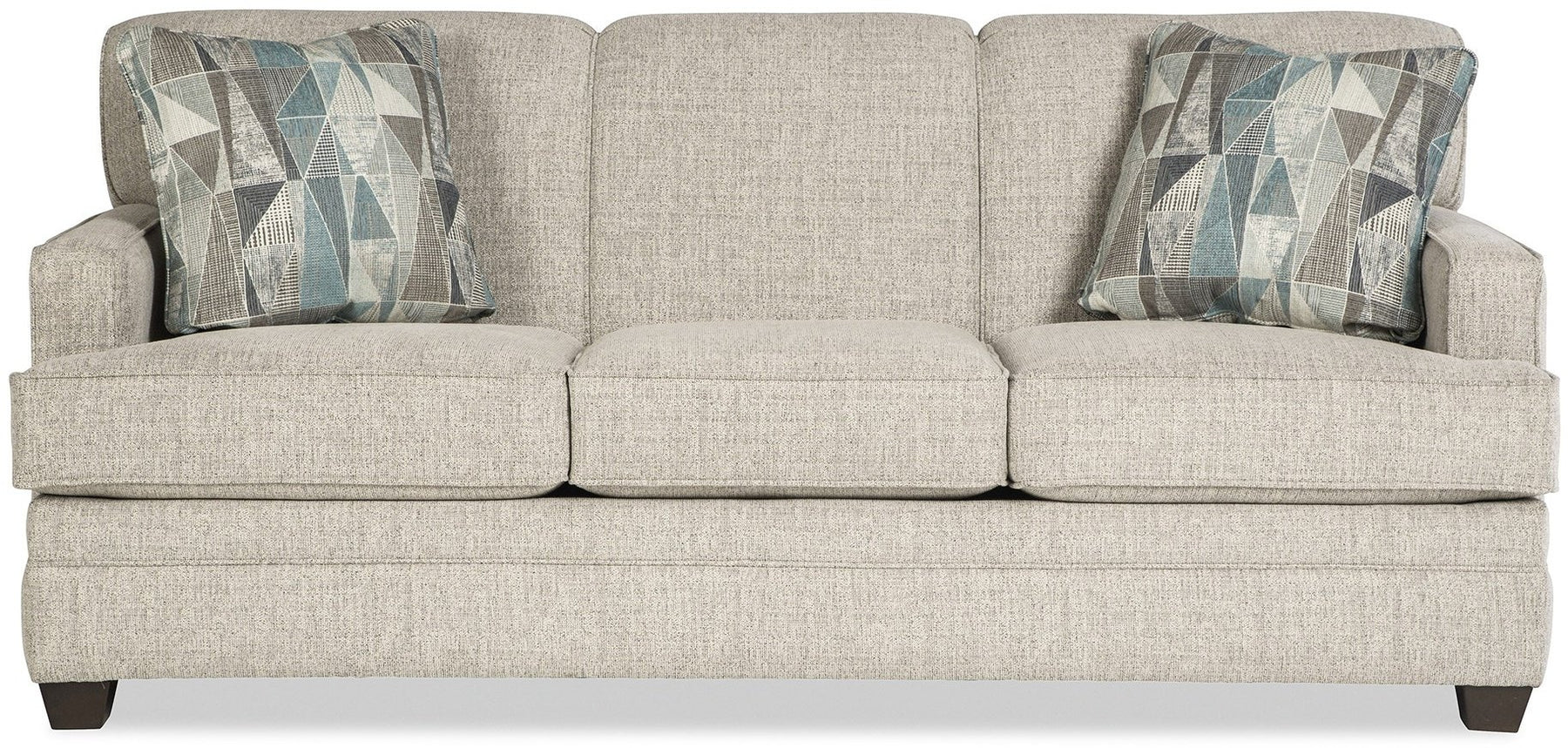 Casual modern styling and easy-to-live-with features make this sofa a perfect choice for your home. It features a tight, drawstring back and welted track arms. A classic 3 seat T-cushion configuration and modern wedge feet complete this inviting look. Matching loveseat, chair, ottoman and queen sleeper also available.