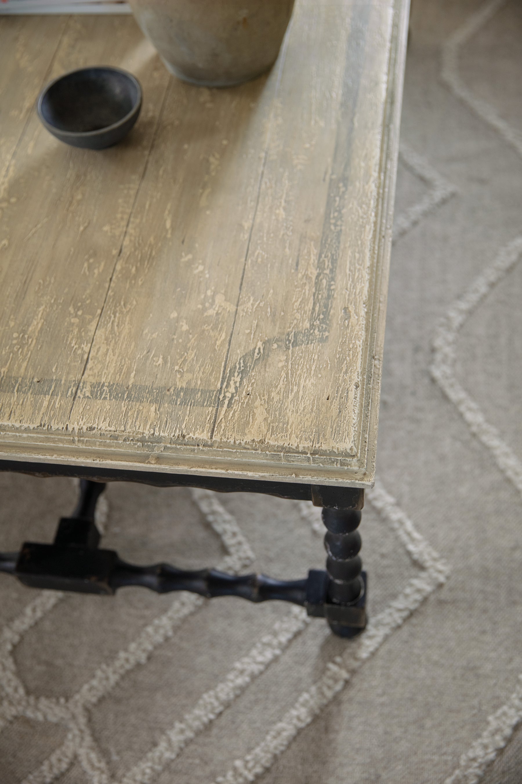 Elegant vintage turned spindle legs in black contrast with a Flaky White-finished top for a look that is farmhouse fresh and inviting. The practical rectangle shape makes this table livable and functional. Crafted of Poplar and Hardwood Solids with Maple Veneers.