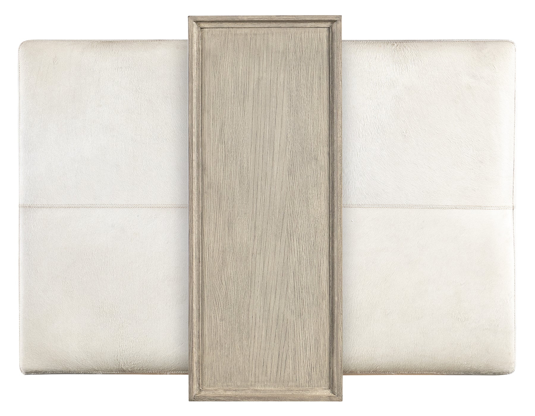 In a user-friendly modern design, the rectangle-shaped Bridged Cocktail Table is upholstered in cream-colored hair-on-hide leather and features a convenient mobile tray top for keeping beverages, snacks or electronics within reach. The tray-top legs are metal-wrapped with a light-finished wood top that matches the wood plinth base.