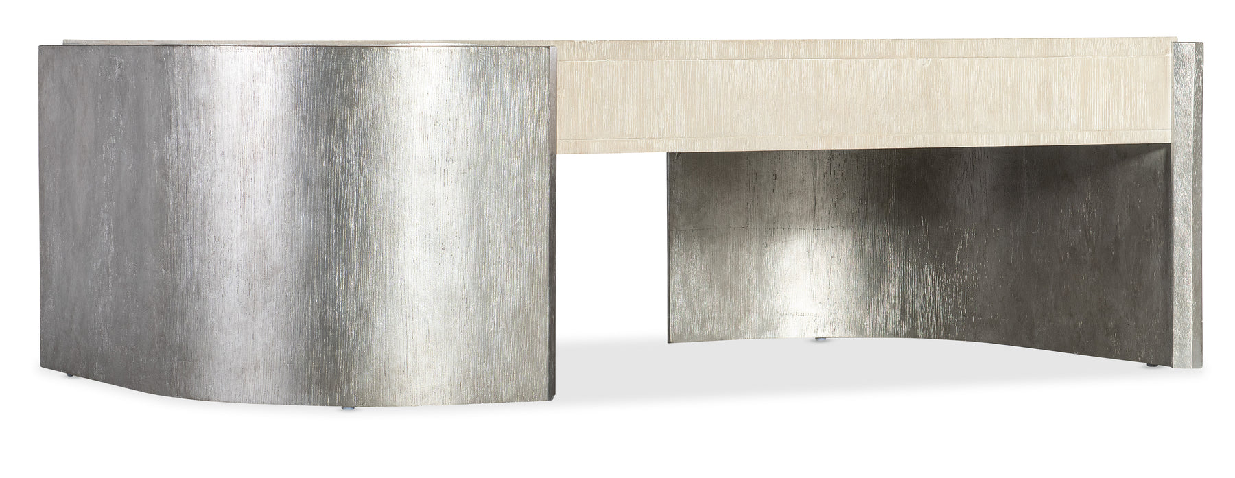 Offering a two-tone finish in a shaped design contrasting Oak Veneers in a light wood finish with a shimmery silver-finished base, the Silverfrost Cocktail Table has a calming contemporary style. One self-closing drawer with silver-finished bar pull.