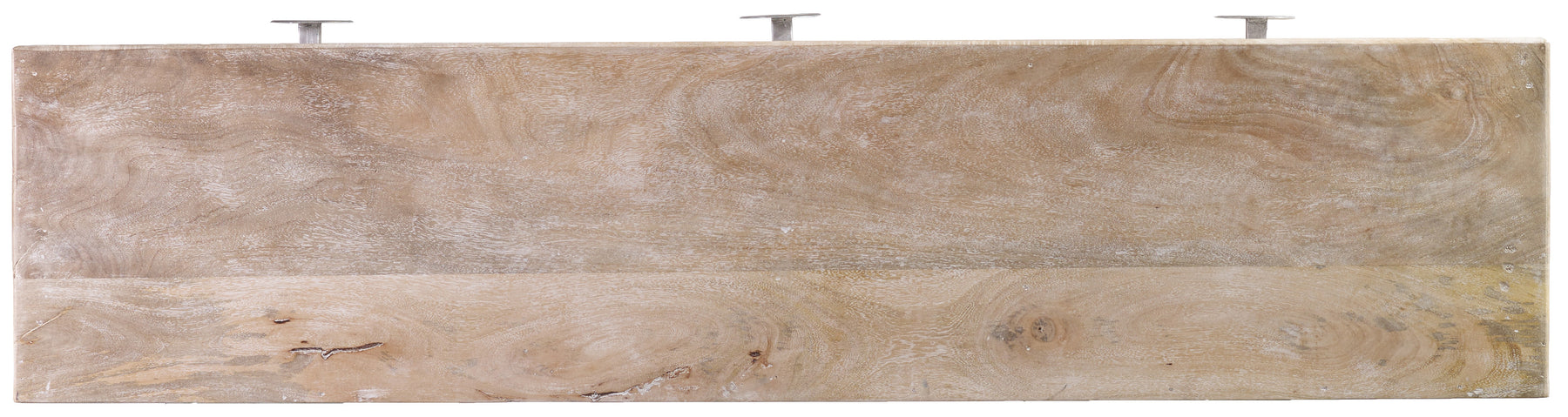 With the dazzling look of sunbursts in natural stone, this stylish console exudes modern elegance and is TV-ready. The piece is crafted of Mango Solids with a neutral-colored, sandblasted whitewash finish and an interlocking iron base. Measuring 69 ½ inches W by 16 inches D and 35 inches H, this console accommodates up to a 65-inch TV.