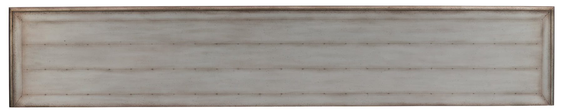 French romance meets modern glam with this TV-ready credenza, sure to be an admired focal point in your home. Crafted of Poplar and Hardwood Solids with Maple Veneers and Eglomise with Aluminum, Metal Buttons and Nails, the credenza has four doors with two shelves behind each set of doors, a ventilated back panel and accommodates up to an 80-inch TV.