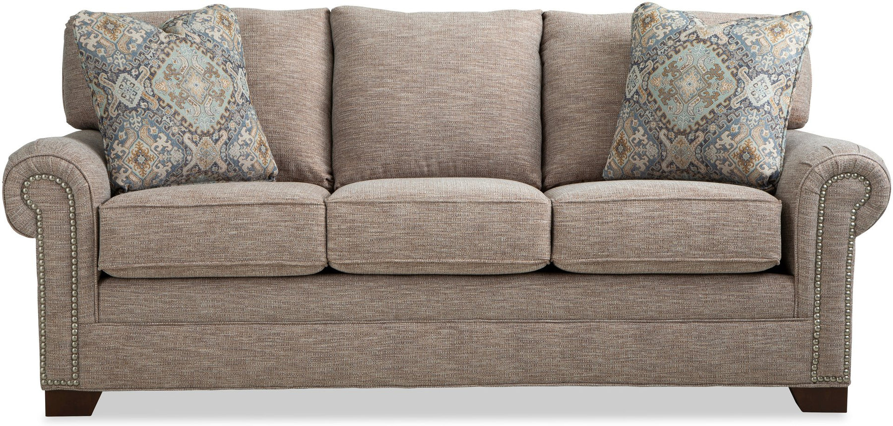 Casual sophistication comes to life in this updated classic sofa. Dark brass nail heads trim the arm panels and accent the pleated rolled arms- set at the perfect height for a good nap! Three seat cushions and three attached backs provide a plush, comfortable place to relax. Tapered block legs offer a modern touch to this simple, but refined look. Also available are the matching sleeper, loveseat, chair and ottoman. Optional nail finishes available. Also available without nail head trim.