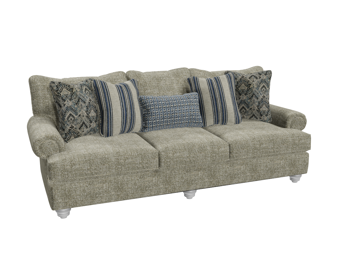 One of our all-time best sellers, this sofa has lots of style and at 100'' in length, it has room for the whole family! It features 3-seats, 3 loose pillow backs, and 5 accent pillows, along with turned legs and a set-back paneled roll arm. But the comfort is what will win you over- deep and plush, this sofa uses our premium cushion and backs to give you a perfect place for relaxing at home. Matching loveseat, chair and ottoman available as well as 88'' length sofa (style 7972) and matching sectional.