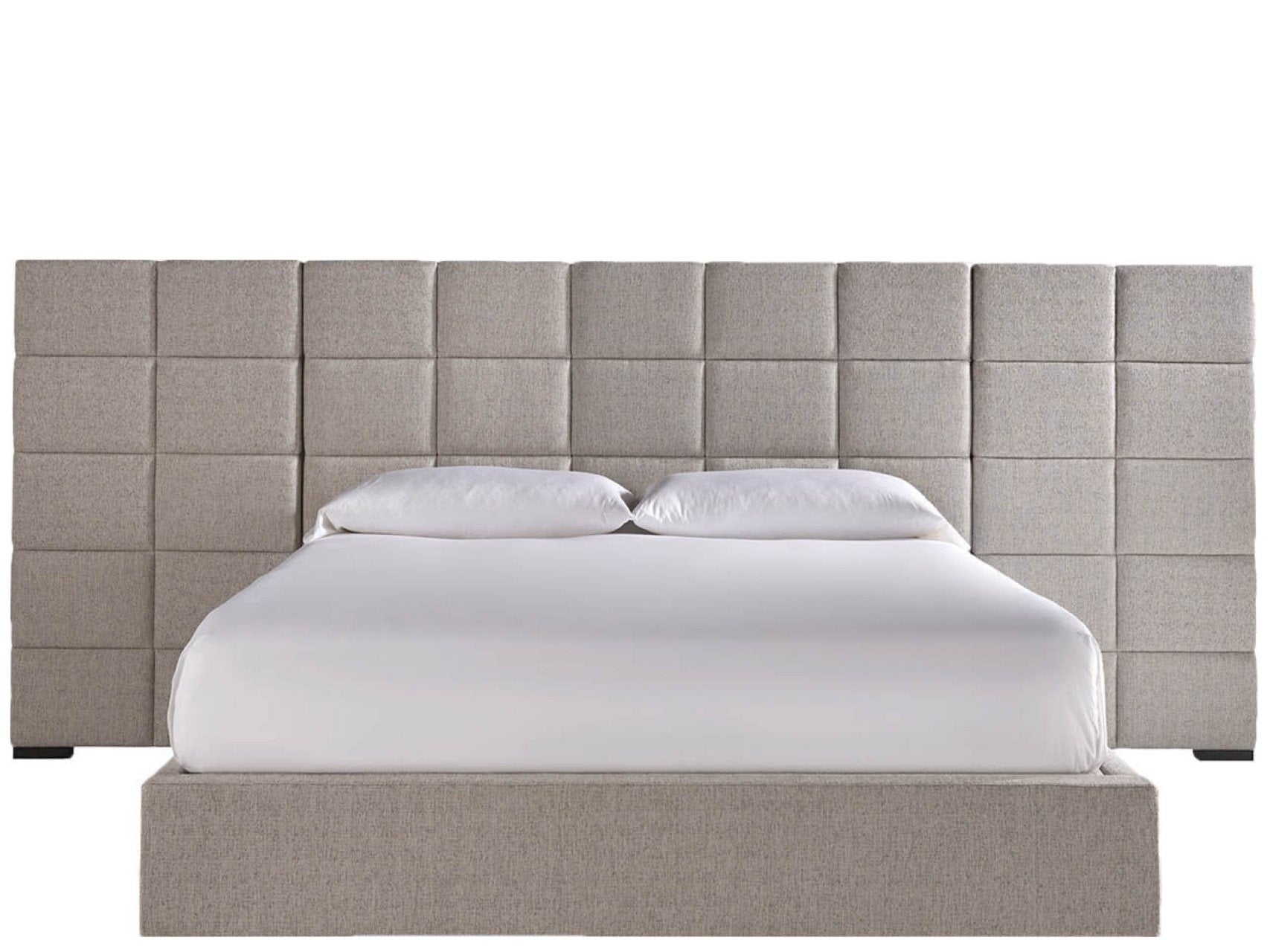 Elevate bedroom spaces with the ultra-sophisticated Bacall King Bed with Wall Panels, a stunning statement piece with a chic grid-like headboard, a fully upholstered bed frame, and two eye-catching, oversized panels.