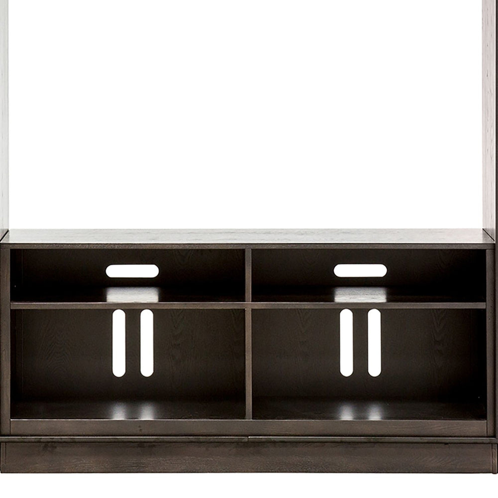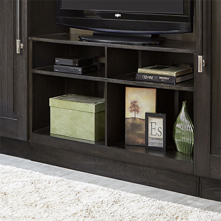 Today’s interior style is highlighted in an entertainment wall. This item features sliding barn style doors with grid overlay bead molding. The charcoal finish gives it a contemporary appeal.
