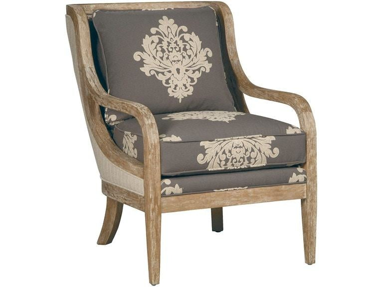 The rich wood detailing on this elegant chair speaks for itself. Gentle curves surround all sides of the upholstery, creating a frame to showcase whatever fabric you love. This chair features an ultra plush seat cushion as well as a loose back pillow for customizable comfort. This style features our weathered oak finish, but use style number 067410 to order in any standard finish.