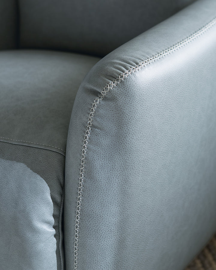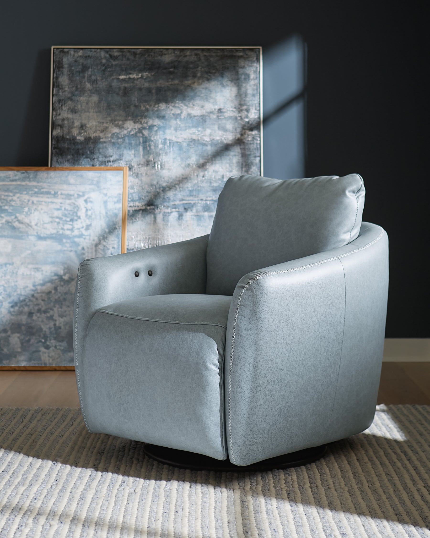Offered in serene light blue Stormy semi-aniline top grain leather with top-stitch detail, the Bonnie Chair has a soft modern look and combines the comfort of both swivel motion and a touch-activated power footrest.