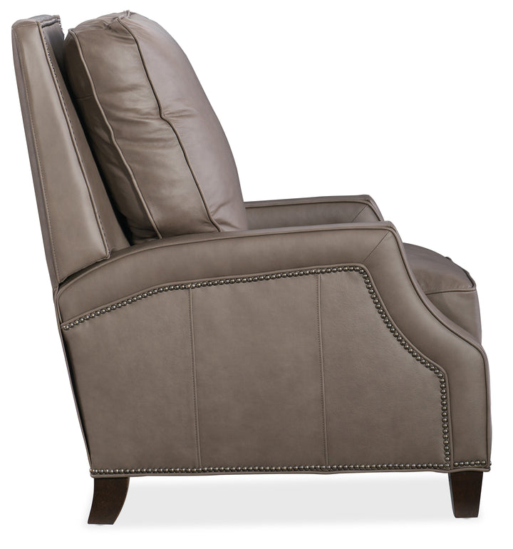 Exquisitely accented by tailored welting on the seat, a modified wing back and nailhead trim on the sides, base and back, the Caleigh Recliner makes comfort look good. The manual recliner pairs the Aspen Lenado finished leather cover in a taupe color with wood legs in the Natchez Brown finish for a warm and welcoming combination.