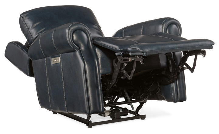 Offered in the brilliant blue Sorrento Night Seas semi-aniline top grain leather cover with contrasting stitch trim, you’d never know the Eisey Power Recliner goes all out for comfort, offering a power headrest, adjustable lumbar support and a usb port to charge your device.