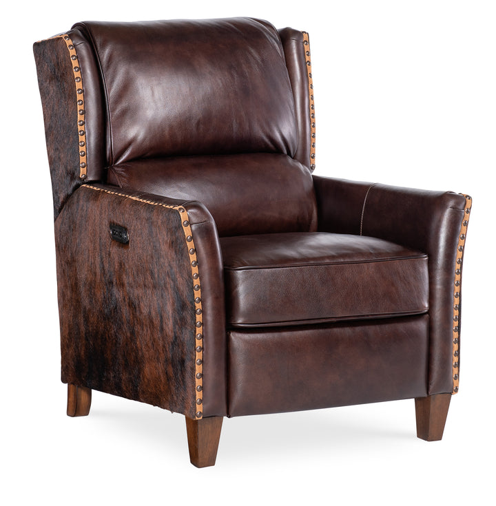 Embrace timeless luxury with the Livingston Power Recliner in Homestead leather from Hooker Upholstery. This traditional recliner features a power headrest and USB port, paired with a dark wood finish for a classic look. Its bustle-style back and tapered wood legs exude elegance, making it a perfect addition to formal living rooms. Transform your space with this exquisite blend of comfort and style.