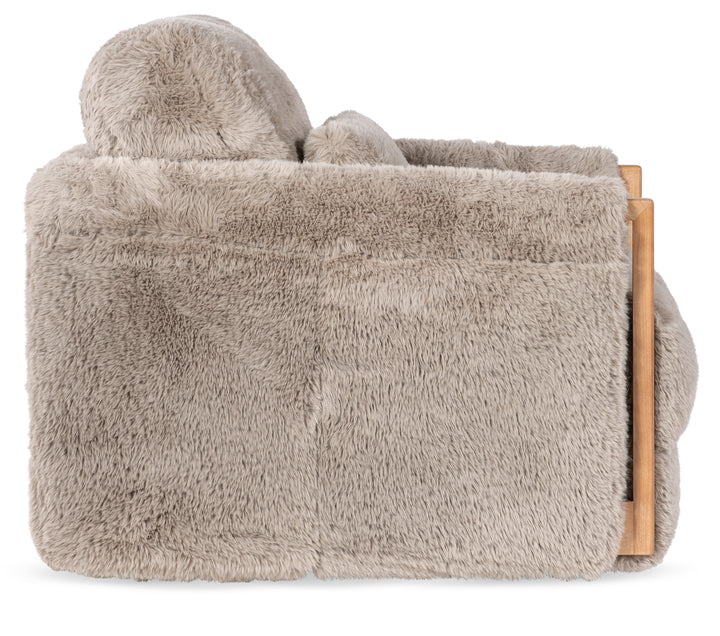 Introduce cozy sophistication to your home with the Meridian Swivel Chair in Yakity Yak Granite fabric from Hooker Upholstery. Designed for modern living spaces, this chair features a plush, furry fabric that adds warmth and texture. It boasts exposed wood trim on the arm fronts, a kidney pillow for enhanced comfort, and a smooth swivel motion for versatility. Enhance your décor with this chic yet practical addition that promises both style and comfort.