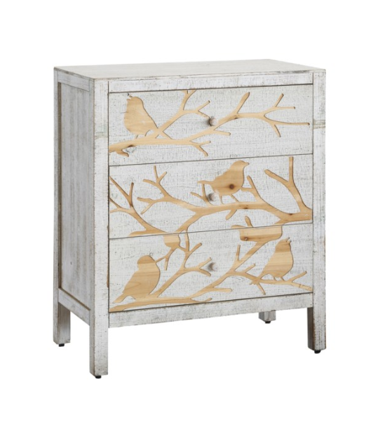 Morning Dove 3 Drawer Washed White and Routed Out Bird Design Chest Dimensions: 27.5x15x31"