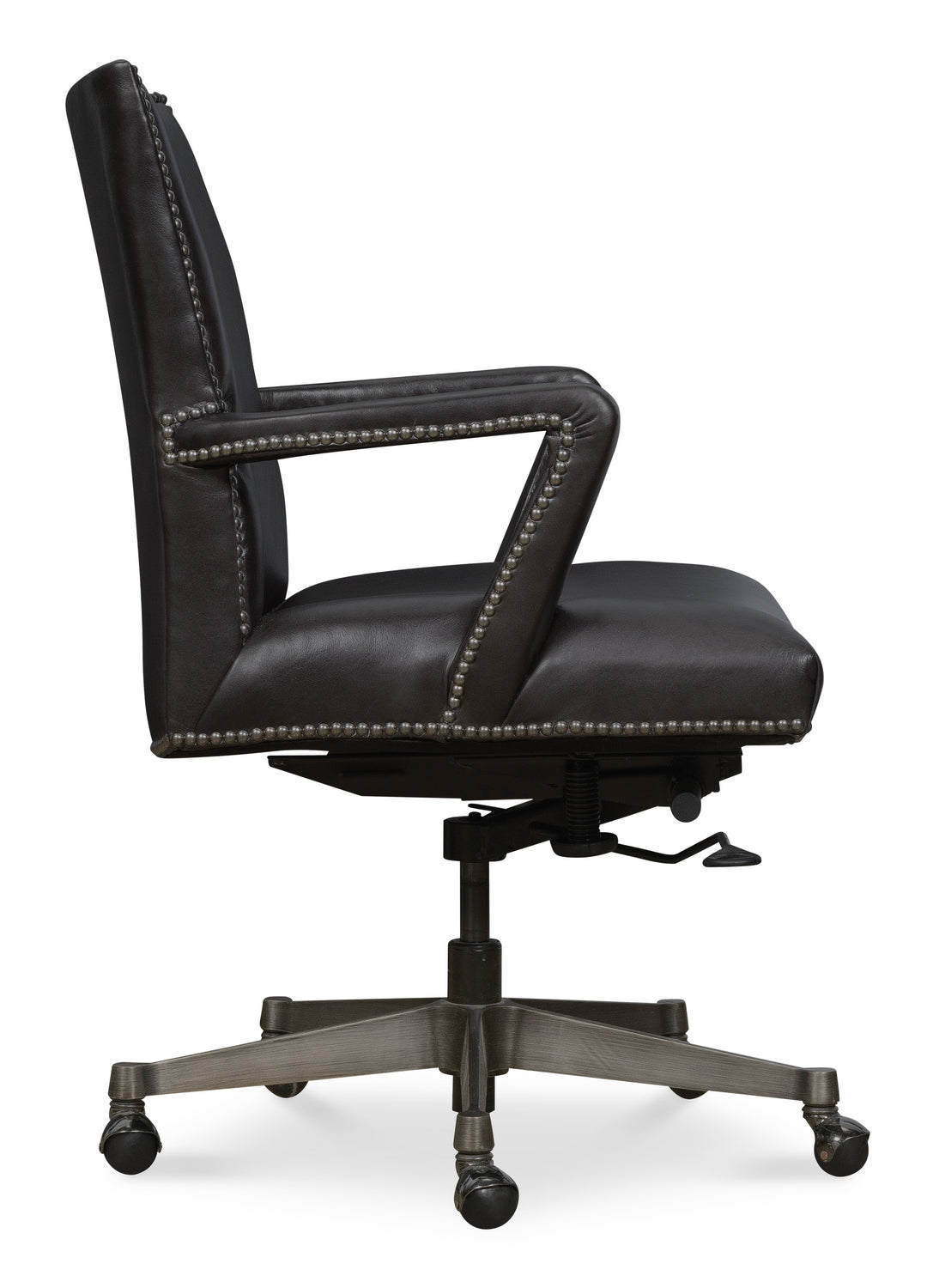 The Phoenix Executive Swivel Tilt Chair in Graphite leather combines industrial modern aesthetics with superior comfort. Its leather-wrapped open-arm design, nailhead trim, and gunmetal base create a striking look for any home office. Durable and sophisticated, this chair offers both form and function with black nickel casters for ease of movement.