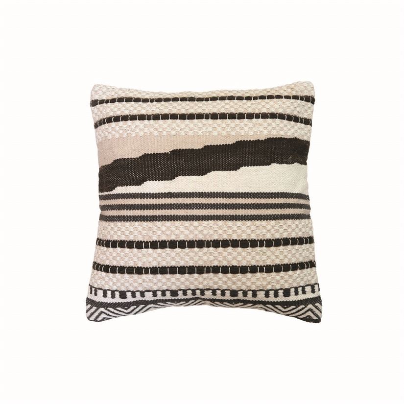 Hand-woven of wool and cotton, and filled with plush polyester, it has beautifully bold black patterns.