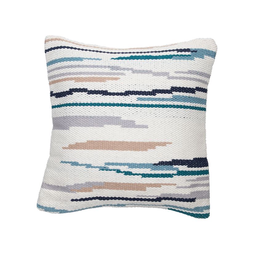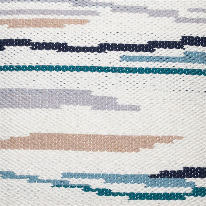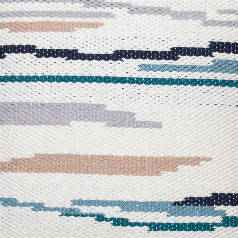 Scattered across this piece are navy, tan, gray, teal, and sky blue handwoven lines arranged into a bright and beautiful display.