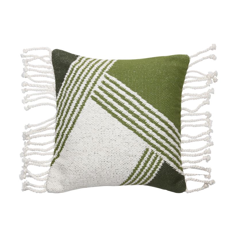 Sections of green shades are separated by a series of stripes as this rich piece is then brightened by the white roped edges that run along its sides.