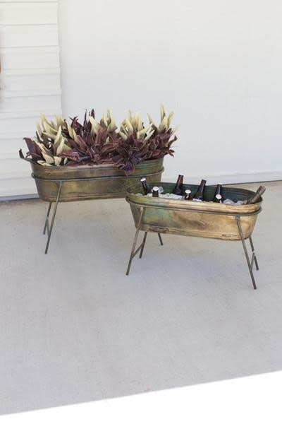 Set Of Two Oval Metal Planters On Stands - Antique Verdigris
